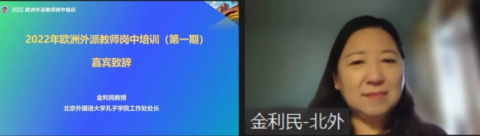 金利民处长在开班仪式致辞中代表北外向参加本次培训项目的所有在岗教师表示欢迎,她表示,北外和北外孔子学院工作处高度重视孔子学院建设工作,并将一如既往地支持外派汉语教师的个人发展,持续为各孔子学院提供交流研讨、增进友谊、建立合作、共同进步的机会。她相信参训的在岗教师们会珍惜这次宝贵的线上学习机会,全面提升汉语教学专业能力,增强心理抗压能力。