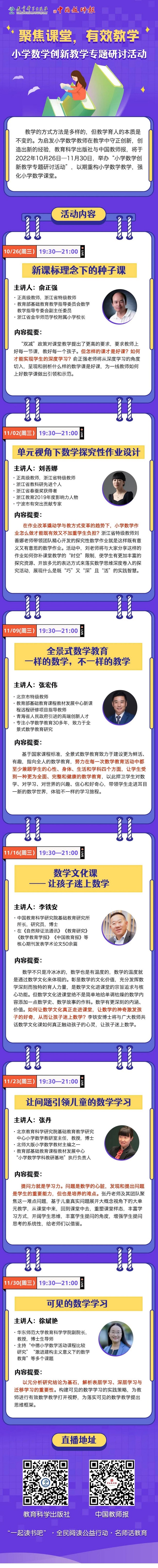 教学的方式方法是多样的,但教学育人的本质是不变的。为启发小学数学教师在教学中守正创新,创造出新的经验,教育科学出版社与中国教师报,将于2022年10月26日—11月30日,举办“小学数学创新教学专题研讨活动”,以期重构小学数学教学,强化小学数学课堂。活动将邀请小学数学领域的名师、专家,多角度剖析小学数学教学。告诉你,如何通过种子课而走向深度学习,如何进行探究性作业设计,如何开展全景式数学教育,如何让问题引领儿童的数学学习,如何让数学文化走进课堂,如何让数学学习可见等。
