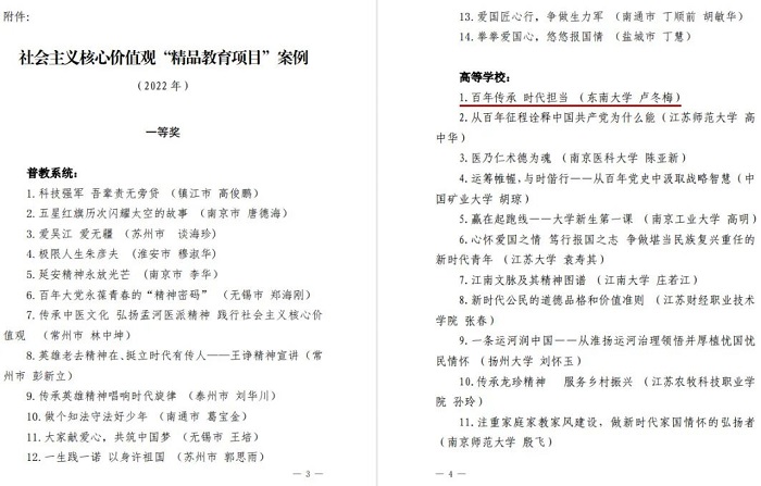 近日,江苏省教育系统关工委发布通知(苏教关委〔2022〕10号),公布了2022年社会主义核心价值观“精品教育项目”案例获奖名单,一等奖28项、二等奖72项。东南大学出版社退休老师卢冬梅主讲的《百年传承 时代担当》荣获一等奖。
