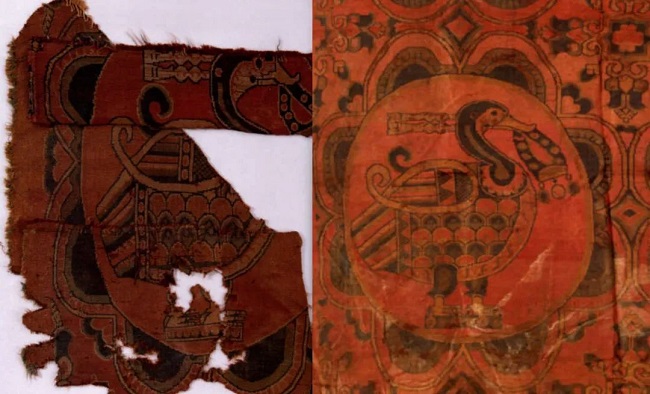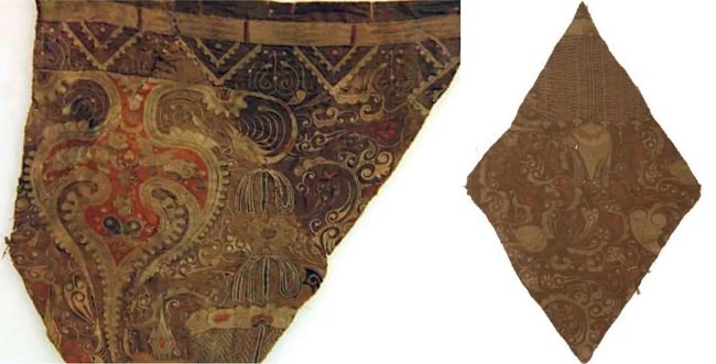 ▲左:青海都兰出土五色鸟锦图,唐 右:中国丝绸博物馆藏五色鸟锦,唐