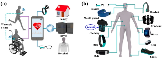 ▲a:可穿戴设备应用原理 b:人体各部位佩戴的可穿戴设备