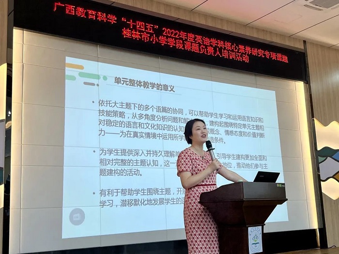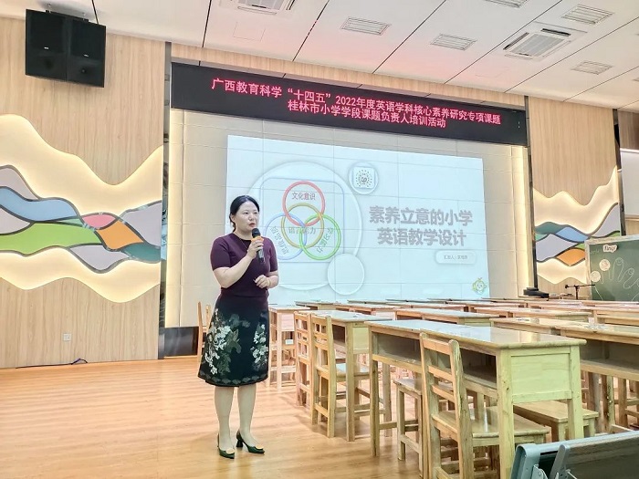 10月20日-21日,由外语教学与研究出版社(以下简称“外研社”)和桂林市教育科学研究所主办的广西教育科学“十四五”2022年度核心素养研究专项课题桂林市小学学段课题负责人培训活动在桂林市复兴小学顺利举行。桂林市教科所副所长申治云,桂林市教科所科研规划办副主任莫莺燕,桂林市复兴小学校长张丹东,外研社基础营销总监陈子昱等出席了会议。桂林市17个区/县的小学英语教研员以及桂林市2022年度核心素养研究专项课题小学学段课题负责人到场参加会议。