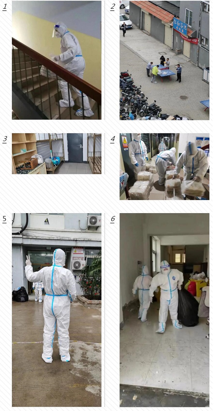 每天三次送餐时,他们都要穿着防护服上下六层公寓,为确保自己支援楼栋近1000名学生能更快更早吃上热乎乎的饭菜,全然不顾汗水浸湿全身,努力克服呼吸不畅、全身酸痛的困难。为减少更换衣物次数,每次工作结束后靠自然风干衣服上汗水,不能洗浴就靠毛巾水盆擦拭身体。面对清运垃圾、发放物资等多项工作需同时完成时,更是忙得顾不上吃饭,几次出现虚脱、抽筋的情况,但他们依然咬牙坚持,没有耽误过一点工作。但他们表示,出版社建社始便是筚路蓝缕、不畏艰险,我们现在做的只是接过前人的薪火,传承前人的风骨,我们有信心早日取得全面胜利。