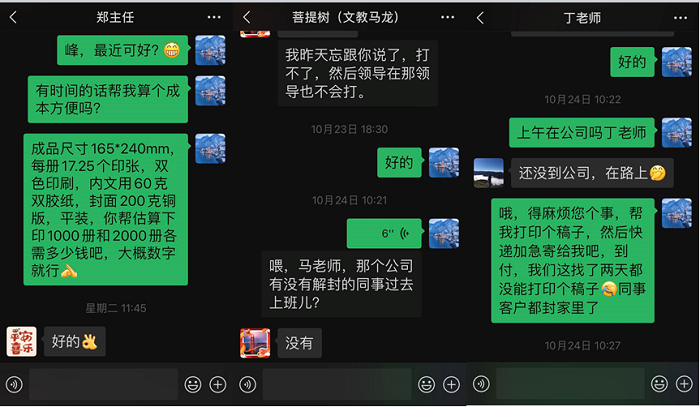 在接下来的工作中,于社长联系我指导工作,且多次询问业务情况。同时,我们出版部及党政办、主编室、排版设计部、质检部、营销发行及仓储部、财务部等同事都给予了支持和配合,对相关工作有问必答,毫无保留。其间,时间有早有晚,老师们一句“都是为了工作”,让我瞬间释怀。
