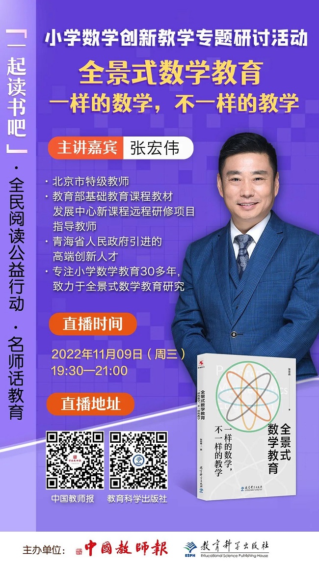 11月9日晚7点半,将举办本次专题活动的第三场“全景式数学教育——一样的数学,不一样的教学”。基于国家课程标准,全景式数学教育致力于建设更为鲜活、有趣,指向全人的数学教育,努力在每一次数学教育活动中都至少兼顾学生的心性、身体、生活和学科四个方面,让学生受到一种更为全面、完整和健康的数学教育,以此捍卫学生对数学、对学习、对世界的兴趣、信心和好奇心,带领学生走进耳目一新的数学世界,体验不一样的学习旅程。