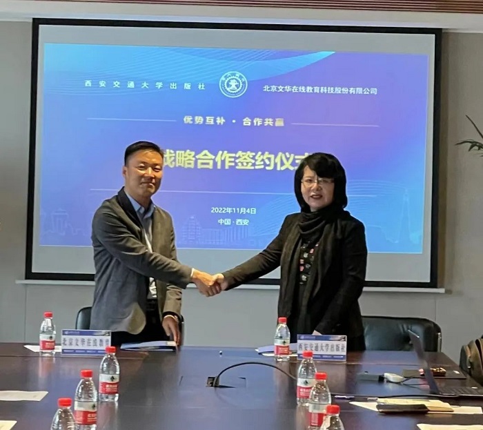 为构建融合发展新格局,加强出版业与互联网行业间协作,全面推进“大思政课”建设,打造“大思政”云平台,11月4日西安交通大学出版社与北京文华在线教育科技股份有限公司举行战略合作协议签约仪式。