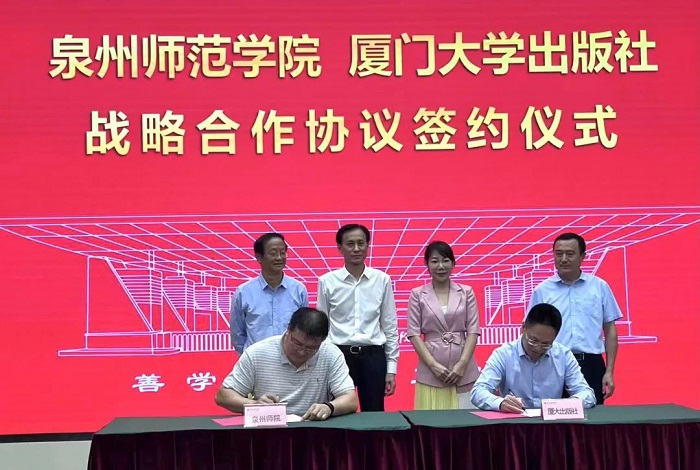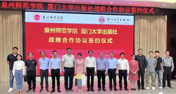 11月10日下午,厦门大学出版社与泉州师范学院举行“战略合作签约仪式”。泉州师范学院党委书记朱世泽、党委副书记林伟、副校长夏侯建兵,厦门大学出版社党总支书记洪秋霞、总编辑施高翔、副总编辑陈进才、副社长欧光江、原社长蒋东明、特聘编审黄茂林及双方有关部门同志出席仪式。