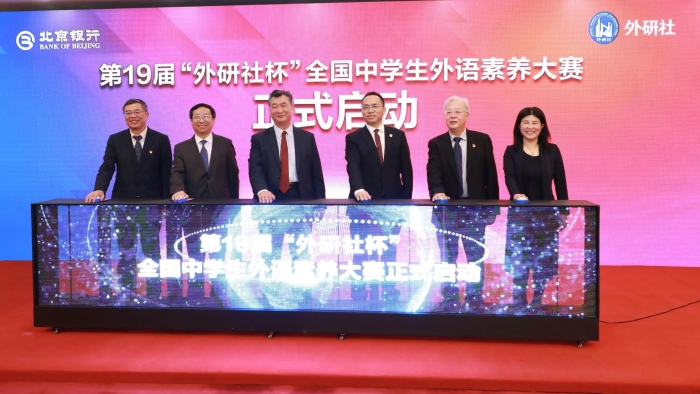 北京银行党委书记、董事长霍学文,北京外国语大学党委副书记、校长杨丹,北京银行党委副书记、行长杨书剑,北京银行党委副书记钱华杰,中国搜索副总裁邵军,北京外国语大学外研集团党委书记、董事长、外研社社长王芳,共同启动了第19届“外研社杯”全国中学生外语素养大赛。