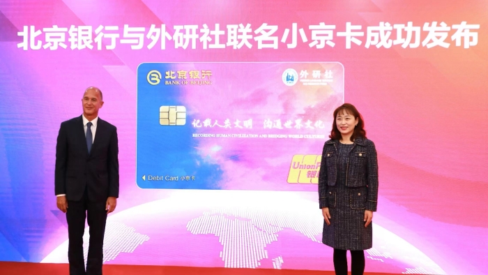 北京银行副行长魏德勇与北京外国语大学外研社党委副书记陈媛媛共同为“外研社&北京银行”联名纪念版小京卡揭卡。双方将以联名卡的诞生为契机,优势互补紧密合作,共同助力青少年儿童财商教育、阅读素养及社交能力提升。