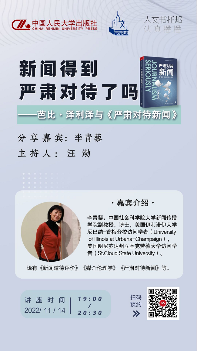 2022年11月14日,《严肃对待新闻》一书译者、中国社会科学院大学副教授李青藜,将做客“人文书托邦认真播播”系列直播,与编辑汪渤(BoBo老师)和我们分享“新闻得到严肃对待了吗?——芭比·泽利泽与《严肃对待新闻》”这一主题。