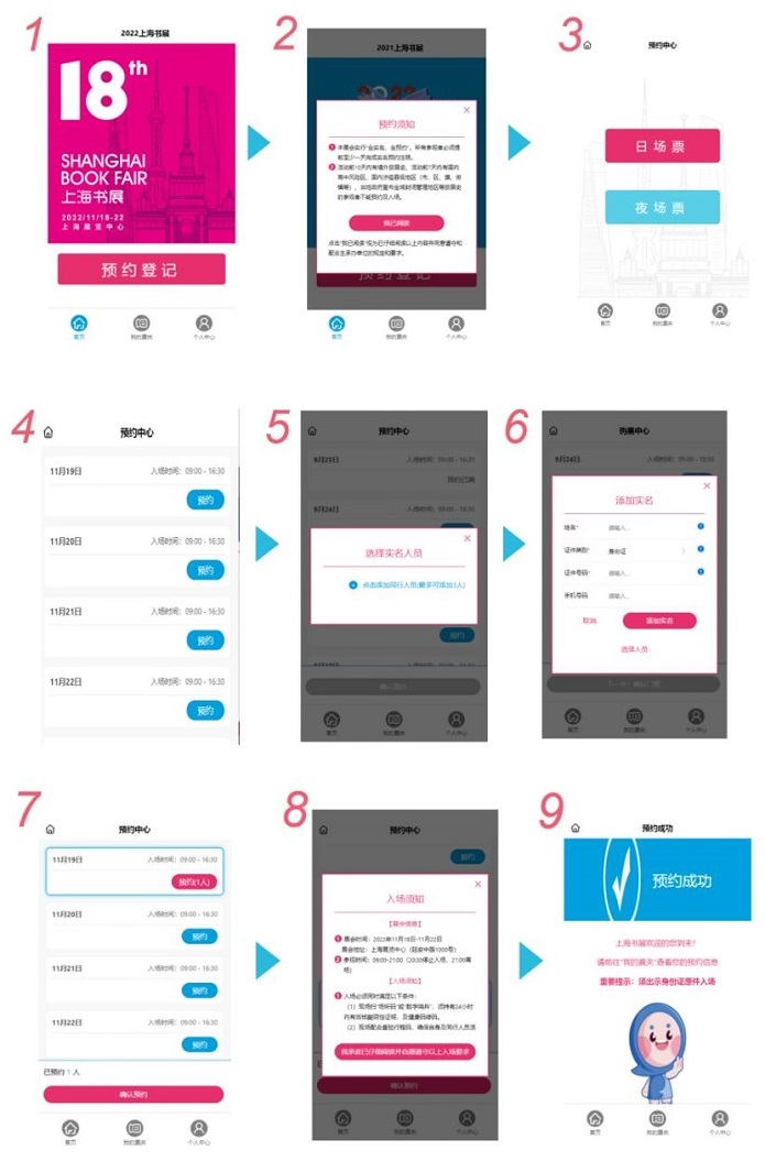 1. 通过小程序“我爱读书我爱生活”实名预约后(含姓名、手机号、身份证号等),将接收到短信提示,在入场前完成防疫申报(上传行程码、核酸报告截图等),通过短信告知审核信息及入场操作办法。
