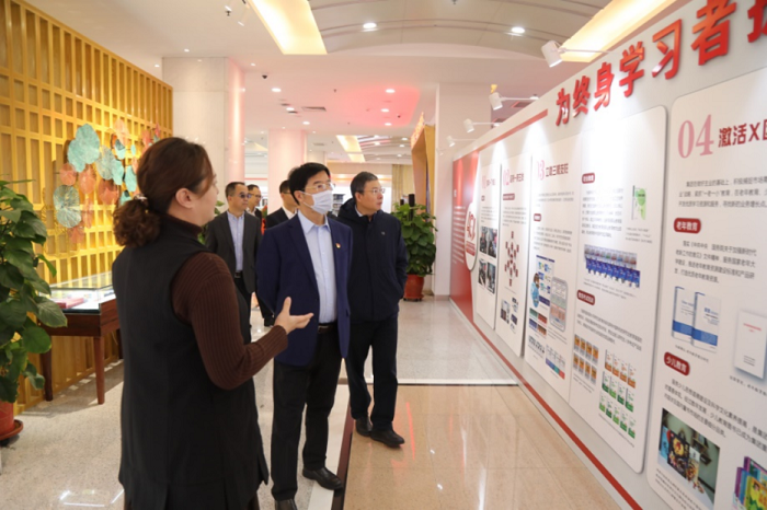 杜玉波在国家开放大学出版传媒集团总编辑刘占荣,副总经理李永强、安薇,副总编辑贾玉超的陪同下,参观集团“守初心 融新境 领征程”成果展及演播室等。