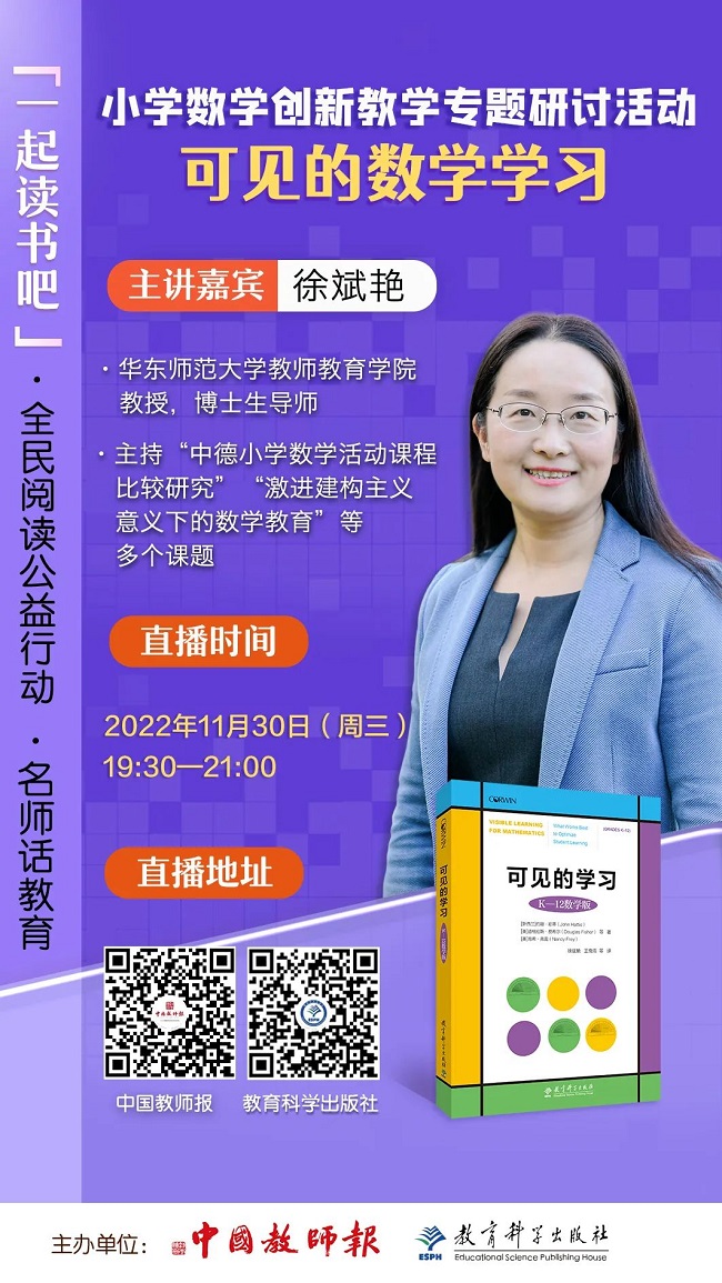 随着“双减”政策和2022版课标的出台,教学改革已经进入了前所未有的广阔空间。教学的方式方法是多样的,但教学育人的本质是不变的。为启发小学数学教师在教学中守正创新,创造出新的经验,教育科学出版社与中国教师报于2022年10月26日—11月30日,举办“小学数学创新教学专题研讨活动”,以期重构小学数学教学,强化小学数学课堂。活动将邀请小学数学领域的名师、专家,多角度剖析小学数学教学,告诉你如何通过种子课走向深度学习,如何进行探究性作业设计,如何开展全景式数学教育,如何让问题引领儿童的数学学习,如何让数学文化走进课堂,如何让数学学习可见等。