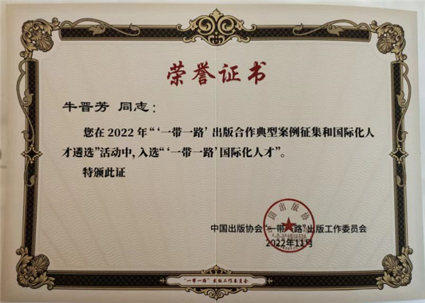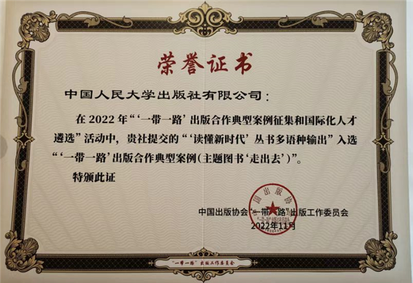 2022年11月27日,中国出版协会“一带一路”出版工作委员会在天府书展上公布2022年“一带一路”出版合作典型案例征集和国际化人才遴选结果,中国人民大学出版社再获两项荣誉。“‘读懂新时代’丛书多语种输出”入选“‘一带一路’出版合作经典案例(主题图书‘走出去’)”;牛晋芳编审入选“‘一带一路’国际化人才”。