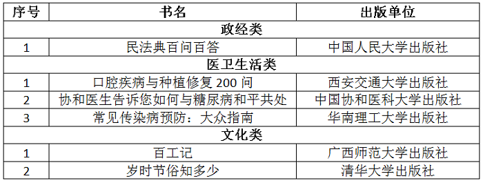 6家大学出版社的6种图书入选2022“农民喜爱的百种图书”,分别是中国人民大学出版社《民法典百问百答》入选政经类图书,西安交通大学出版社《口腔疾病与种植修复200问》、中国协和医科大学出版社《协和医生告诉您如何与糖尿病和平共处》、华南理工大学出版社《常见传染病预防:大众指南》入选医卫生活类图书,广西师范大学出版社《百工记》、清华大学出版社《岁时节俗知多少》入选文化类图书,占比6%。