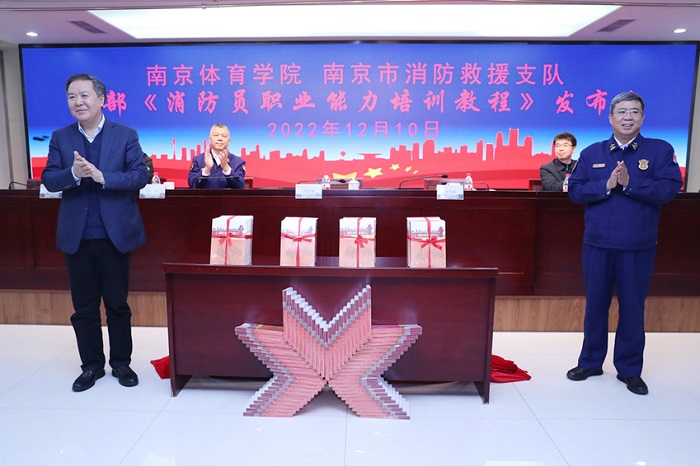 12月10日下午,南京体育学院与南京市消防救援支队“党建共建:助推橄榄绿交棒火焰蓝,首部《消防员职业能力培训教程》发布会”在灵谷寺校区举行。江苏省消防救援总队党委书记、政治委员刘锡鑫,南京体育学院党委书记朱传耿,南京市消防救援支队党委书记、政治委员孙山,南京大学出版社社长金鑫荣等领导出席发布会。南京体育学院党委副书记兰亚明主持发布会。