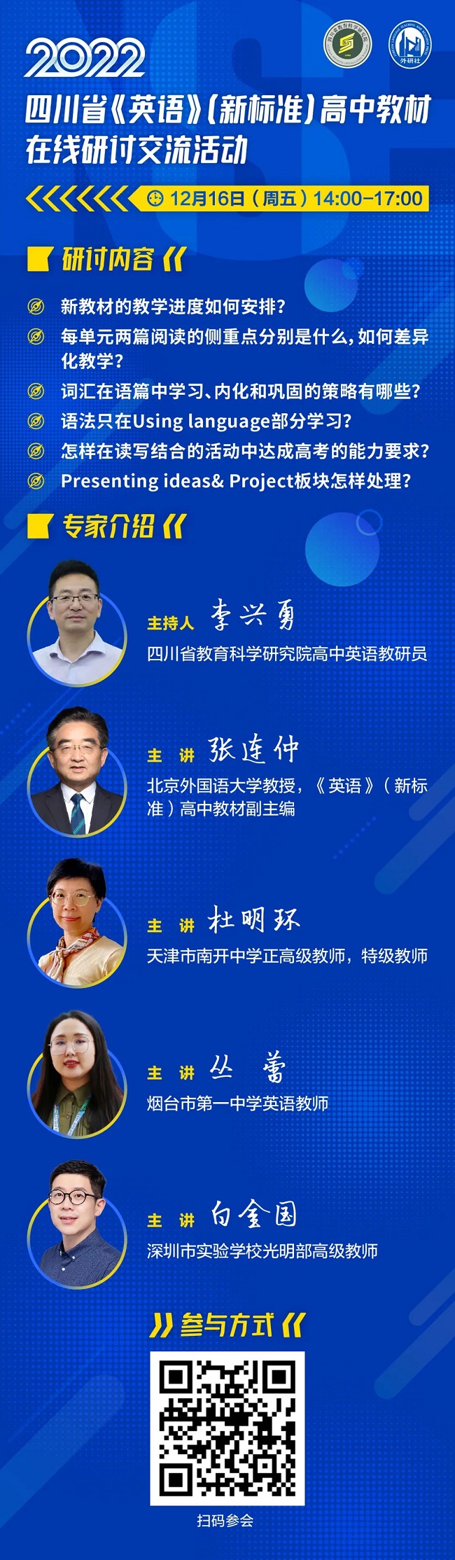 基于前期全员问卷调研和骨干教师在线研讨内容的分析整理,12月16日,外研社将邀请《英语》(新标准)高中教材副主编张连仲教授携手深圳、天津、烟台优秀一线教师做客直播间,从一线实践的角度和四川省广大高中英语教师就大家在新课程实施过程中普遍感到的困惑和的痛点问题进行专题交流,敬请关注。