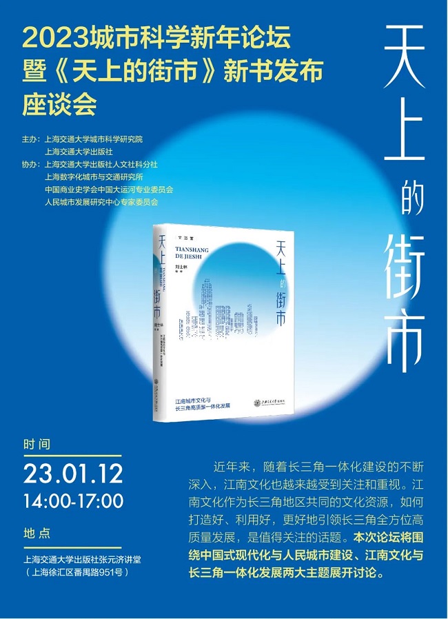 1月12日下午,由上海交通大学城市科学研究院、上海交通大学出版社主办的2023城市科学新年论坛暨《天上的街市》新书发布座谈会将在上海交通大学出版社张元济讲堂举行。