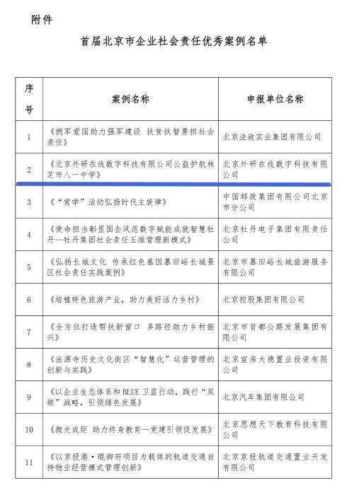 为推动北京市企业积极履行社会责任,构建具有“首善之区”特色的企业履行社会责任标准体系,北京企业联合会、北京市企业家协会组织开展了首届“北京市企业社会责任优秀案例”征集活动。凭借“公益援助西藏教育事业、推进教育公平与教育数字化转型”的社会实践,外研在线在开展公益慈善事业、促进社会创新发展等方面具有突出贡献,最终脱颖而出、成功获选。