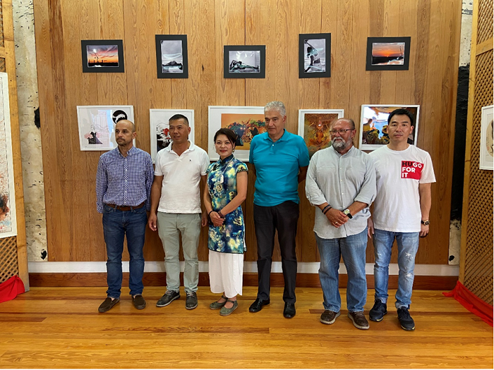 西班牙Dias市市长 José Juan Cruz Saavedra(蓝衣)莅临画展,在山海经画作前留念