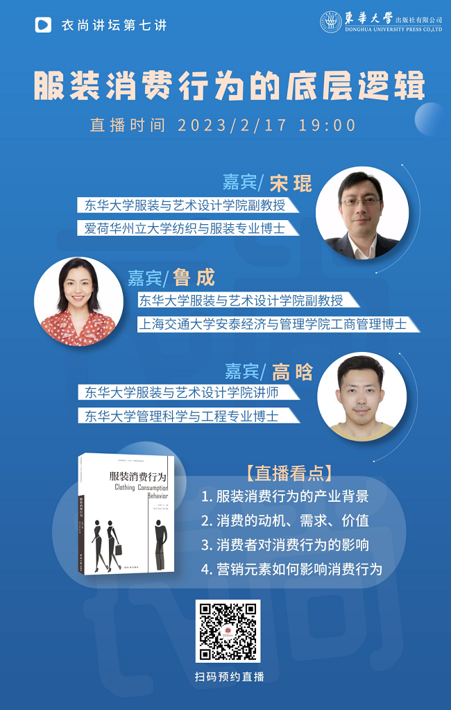 本场新书《服装消费行为》限时6折包邮,2月17日晚7点在东华大学出版社官方微店或者直播间下单,享此优惠。