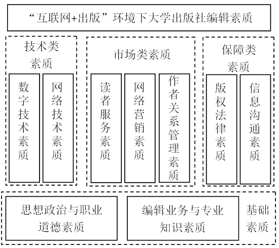 笔者曾在江苏省社科联研究课题“电子商务环境下的大学出版社发展战略研究”项目的基础上并立足于大学出版社在“互联网+出版”环境下的编辑工作特点,探索新的人才培养模式,提出“互联网+出版”环境下大学出版社编辑素质体系,如下图所示: