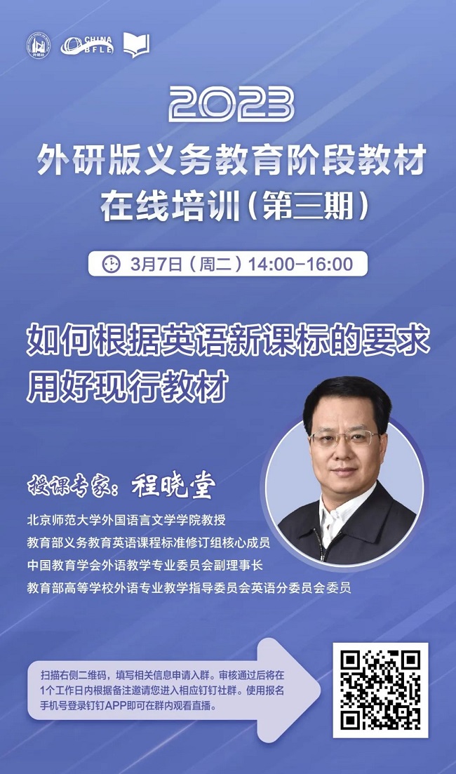 第三期活动将于3月7日(周二)14:00-16:00在“外研社·K12教师发展社区”小初教材专属群和外研社K12视频号同步直播,程晓堂教授将进行主题讲座和案例分享。