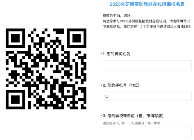 本系列在线培训通过 “外研社·K12教师发展社区”进行。请您于3月6日(周一)20:00前,扫描下方二维码,填写相关信息,申请加入“外研社·K12教师发展社区” (为了直播后培训证书的准确发放,请各位老师提前申请入群)。工作人员将根据备注邀请您进入相应群中,届时您在群中可完成直播收听。
