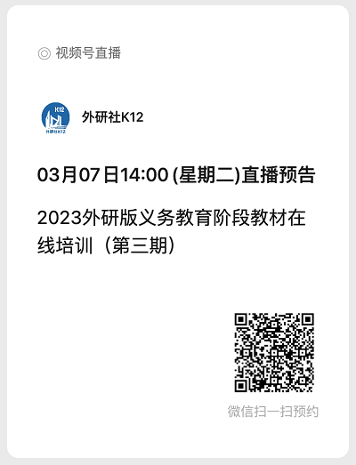 通过“外研社K12”视频号预约直播(无学时证书)。长按识别下方二维码,即可一键预约。