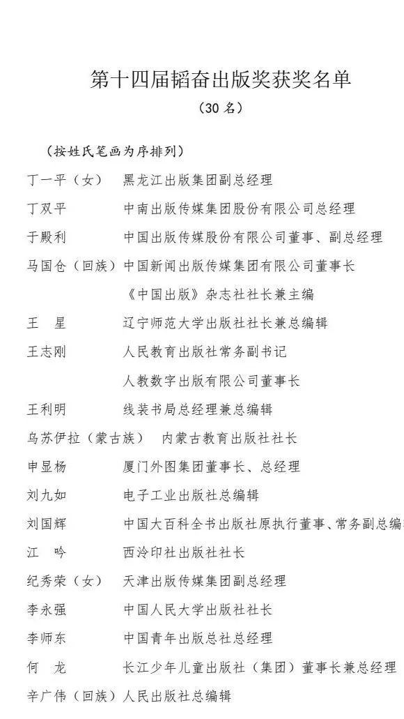 为深入学习宣传贯彻习近平新时代中国特色社会主义思想,全面落实党的二十大精神,推进社会主义文化强国建设,促进出版业高质量发展,坚持“出精品”与“出人才”并重,夯实出版业高质量发展的人才基础,建设一支高素质高水平的出版人才队伍,大力弘扬韬奋精神,表彰和奖励在出版工作中作出突出贡献的先进人物,根据中央宣传部文件批复精神,中国出版协会开展了第十四届韬奋出版奖评选表彰活动,由韬奋基金会协办。评委会秉承科学、严谨、公平、公正、质量第一的原则,经过初评、复评、终评程序严格评选,于2023年2月22日评选揭晓,30位长期勤奋工作在出版一线,身体力行韬奋精神,在出版工作中作出突出贡献的优秀出版工作者荣获第十四届韬奋出版奖。