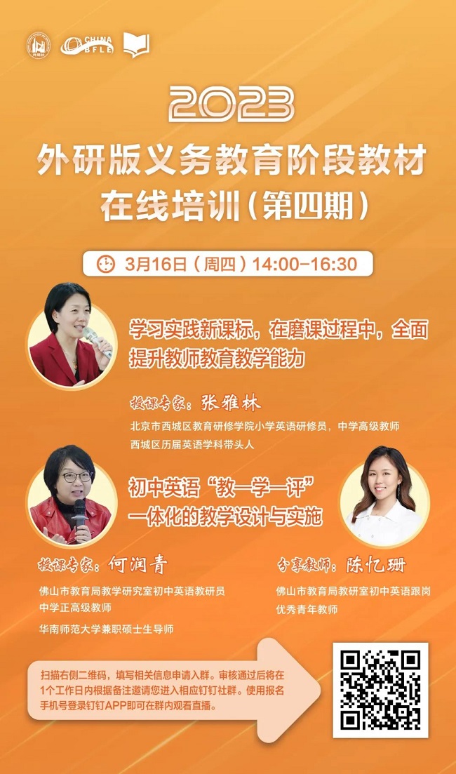 第四期活动将于3月16日(周四)14:00-16:30在“外研社·K12教师发展社区”小初教材专属群和外研社K12视频号同步直播,张雅林老师、何润青老师及其团队进行为我们进行主题讲座和案例分享。