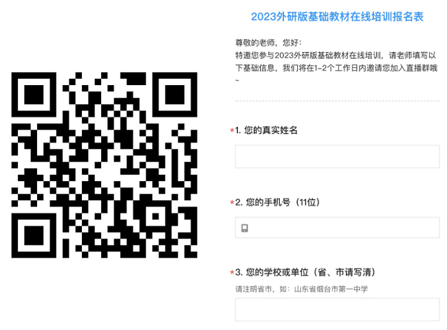 本系列在线培训通过 “外研社·K12教师发展社区”进行。请您于3月16日(周四)10:00前,扫描下方二维码,填写相关信息,申请加入“外研社·K12教师发展社区” (为了直播后培训证书的准确发放,请各位老师提前申请入群)。工作人员将根据备注邀请您进入相应群中,届时您在群中可完成直播收听。