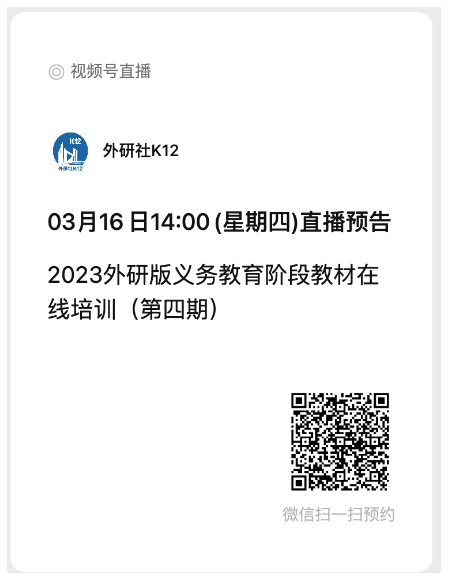 通过“外研社K12”视频号预约直播(无学时证书)。长按识别下方二维码,即可一键预约。