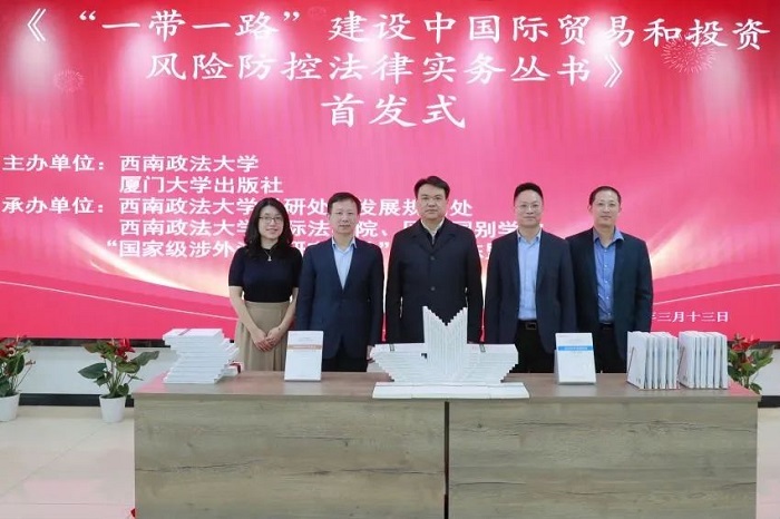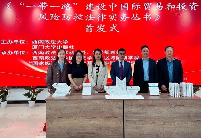 西南政法大学党委书记樊伟,西南政法大学党委常委、副校长唐力,厦门大学出版社总编辑施高翔,西南政法大学科研处处长周尚君,西南政法大学中国-东盟法律研究中心秘书长、丛书总主编张晓君,以及合作单位代表共同启动“一带一路” 建设中国际贸易和投资风险防控法律实务丛书新书揭幕仪式。