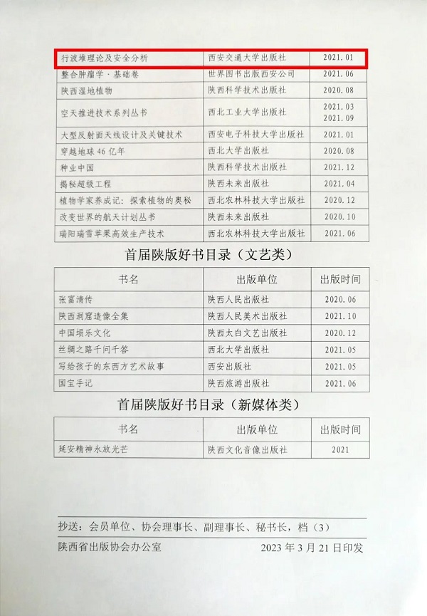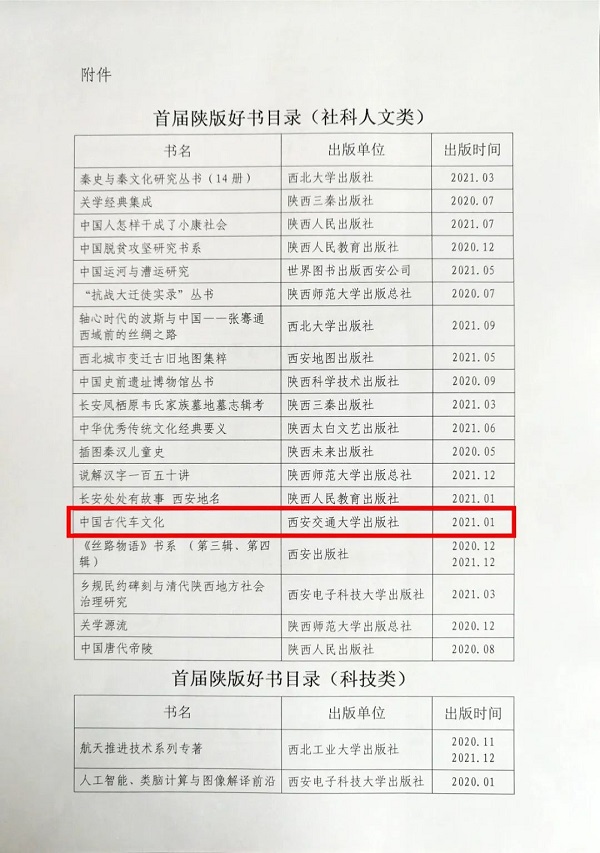 根据陕西省出版协会《陕版好书评选展示活动实施办法》,经陕版好书评审委员会评审,评出首届陕版好书39种,其中,西安交通大学出版社出版的《中国古代车文化》《行波堆理论及安全分析》入选。