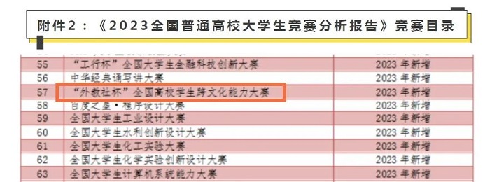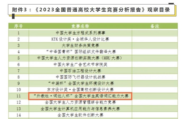 2023年3月22日,中国高等教育学会高校竞赛评估与管理体系研究专家工作组发布《2022全国普通高校大学生竞赛分析报告》。“外教社杯”全国高校学生跨文化能力大赛被列入竞赛目录,“外教社·词达人杯”全国大学生英语词汇能力大赛被列入观察目录。