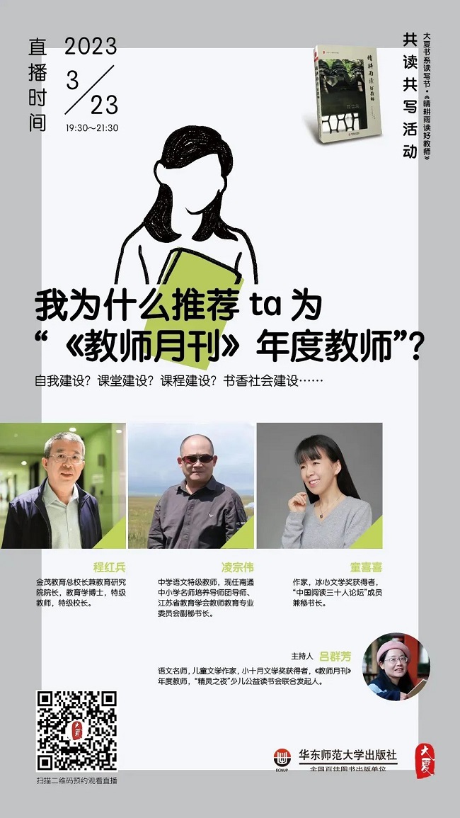 3月23日(周四)晚19:30,我们邀请到了程红兵(上海金瑞学校校长兼金茂教育研究院院长)、凌宗伟(中学语文特级教师)、童喜喜(作家,冰心文学奖获得者) 、吕群芳(语文名师,儿童文学作家)四位嘉宾来为大家揭秘他们心目中的“好教师”。
