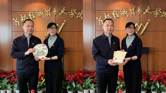 首都经济贸易大学出版社党支部书记、社长杨玲与北京工业大学出版社党支部书记、社长余立互赠图书、纪念品