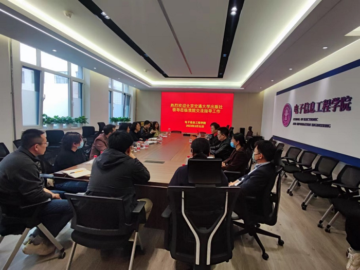 2023年3月31日下午,北京交通大学出版社社长陈颖带队前往北京交通大学电子信息工程学院开展交流研讨。本次会议在九教南115会议室举行。电子信息工程学院党委书记赵岚,副书记、副院长王剑,副院长陶丹参加会议。陶丹主持会议。