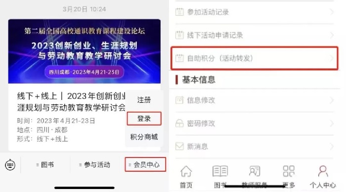 手机端:关注“人大社教师服务”公众号,在底部功能栏点击会员中心——登录,登录成功,在会员中心点击自助积分(活动转发)模块进入上传截图。