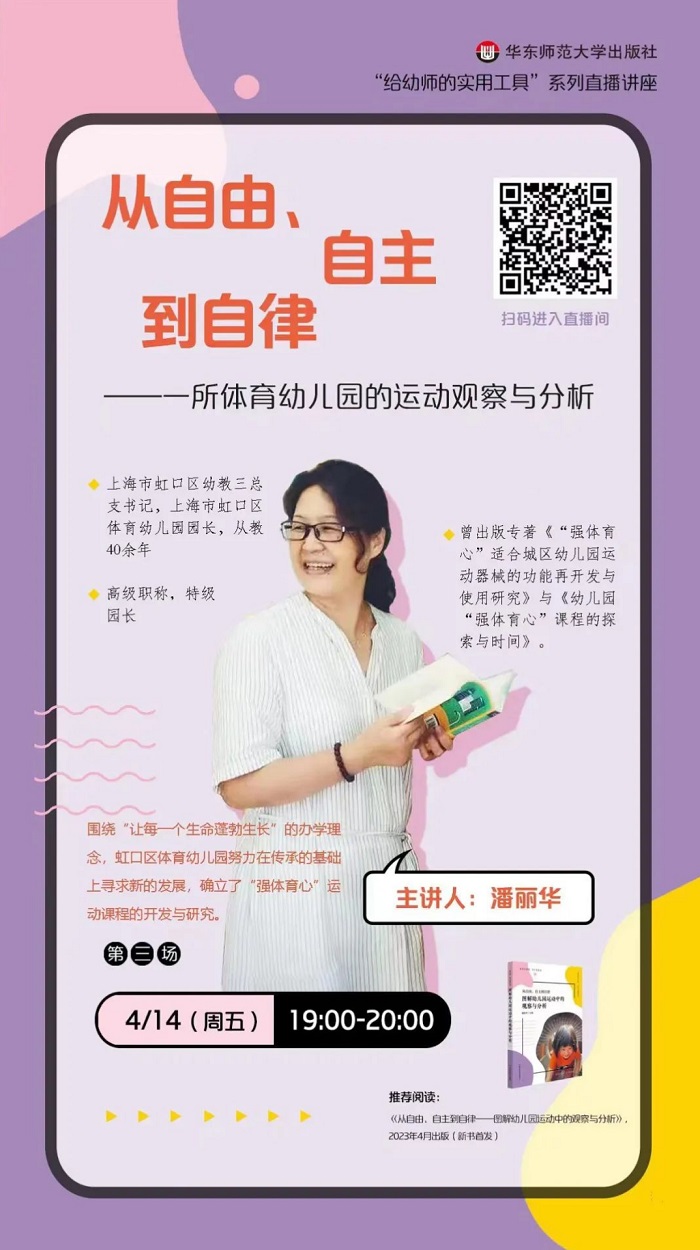 4月14日周五19:00—20:00,示范幼儿园园长潘丽华老师将分享“让每一个生命蓬勃生长”的教育理念,指导幼儿园一线教师开展基于先进理念的更适宜儿童发展的运动课程。