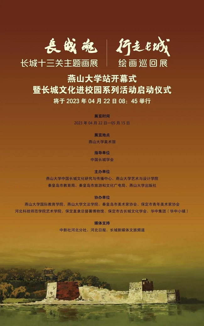 为深入宣传贯彻党的二十大精神,助力长城国家文化公园的建设,做好长城文化价值发掘和文物遗产传承保护工作,进一步传播长城文化,弘扬民族精神,由中国长城学会指导,燕山大学中国长城文化研究与传播中心、燕山大学艺术与设计学院、秦皇岛市教育局、秦皇岛市旅游和文化广电局及燕山大学出版社主办的“长城魂”长城十三关主题画展、“行走长城”绘画巡回展燕山大学站开幕式暨长城文化进校园系列活动启动仪式将于2023年4月22日上午8:45在燕山大学美术馆举办。