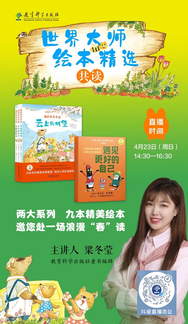 4月23日,教育科学出版社学前教育分社的梁冬莹编辑将携两大系列、九本精美绘本,与孩子、家长以及幼儿园老师们共赴一场浪漫春读。