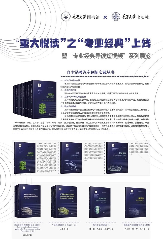 “自主品牌汽车实践创新”丛书是重庆自主品牌汽车协同创新中心联合重庆大学出版社共同策划组织的大型、持续性出版项目。作为优秀的国家出版基金资助项目、重庆市出版专项资金资助项目,本套丛书选题涵盖节能环保、安全舒适、智能网联、可靠耐久4个大方向和15个子方向;集中体现了重庆自主品牌汽车协同创新中心的核心专家、学者在多个领域的前沿技术水平,这些著作主题从实际问题中来,成果也已应用到设计和生产实际中,能够帮助和指导中国汽车企业建设和提升自主研发技术体系,具有现实指导意义。其中《高塑性镁合金材料》已实现版权输出,英文版由爱思唯尔出版集团同步发行。