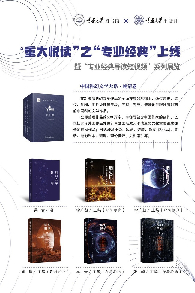重庆大学出版社打造的《中国科幻文学大系》为国家出版基金资助项目,先行启动的晚清卷旨在完整而系统地收集、整理晚清时期出版的科幻小说,为读者提供文献资源和科幻文学盛宴。重庆大学出版社在此奉上“四十二史”丛书,其中包括吴岩老师所著的《科幻文学论纲》、李广益老师编著的《地火行天》等,希望为爱好者提供科幻文学和文化的盛宴,为研究者提供翔实的文献资料和经典的学术著作,切实推动科幻研究这一新兴学术领域的发展。