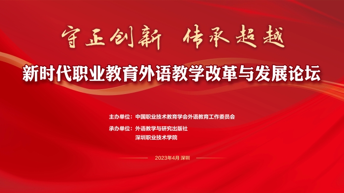 4月14日-15日,由中国职业技术教育学会外语教育工作委员会主办,外语教学与研究出版社、深圳职业技术学院承办的“新时代职业教育外语教学改革与发展论坛”在深圳成功举办。论坛以“守正创新,传承超越”为主题,采用“线上+线下”并行的方式举办,万余名职业院校外语教师参会,为外语教学的改革创新与高质量发展,谋划新举措、贡献新方案。