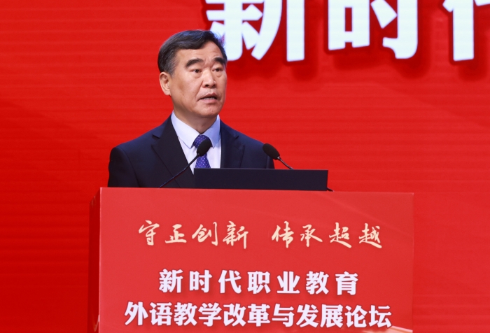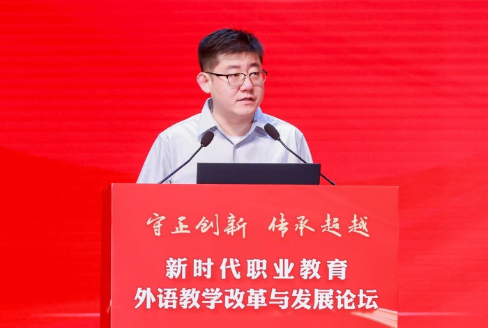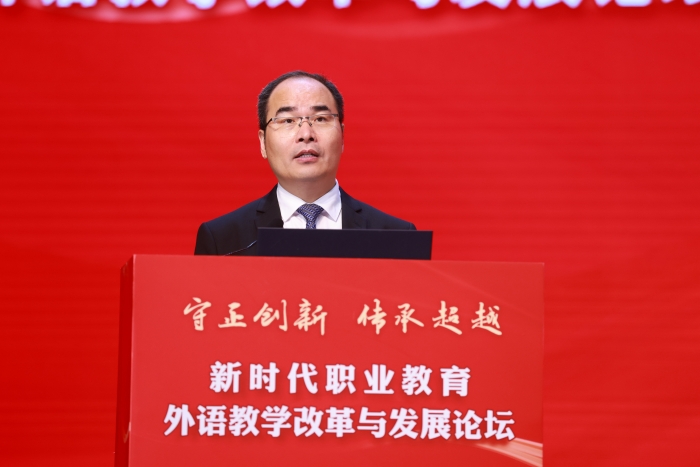 张磊在致辞中表示,在全国职教系统深刻领悟两会精神,认真落实《关于深化现代职业教育体系建设改革的意见》开局起步之际,本次论坛的召开,回应了职业教育的时代使命,展示了外语教学的育人成果,很有意义。围绕新时代职业教育的发展大势与工作部署,张磊提出三点建议:一是深刻把握改革发展新形势。深化外语教学改革创新,助推职业教育“引进来”与“走出去”,助力产教融合、校企合作,促进教育链、人才链与产业链、创新链的深入融合、有机衔接;二是着力加强教学资源建设。充分发挥中国职教学会的智库作用,深入推进外语教学标准修订、课程体系优化、教学模式改革、人才需求调研、课程思政建设等改革探索;三是主动融入数字化建设。立足数字化人才培养,加快职业教育数字化转型,持续开发专业资源库、数字化教材、在线精品课等优质数字化资源,深入探索数字化赋能职业教育外语教学的新模式、新路径。