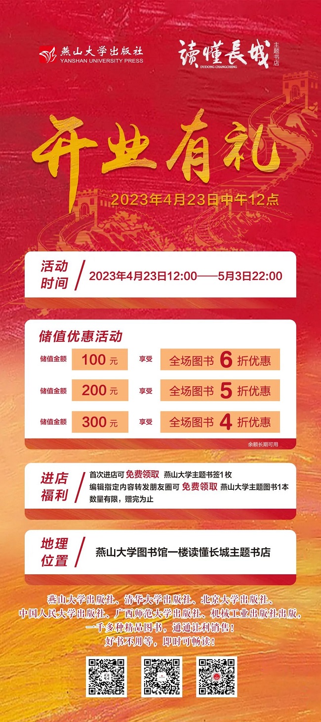 读懂长城主题书店于2023年4月23日12:00—5月3日22:00推出储值优惠活动,根据储值金额不同享受不同的购书优惠(详见上图)。同时,活动期间,首次进店可免费领取1枚燕山大学主题书签,编辑指定内容转发朋友圈可免费领取1本燕山大学主题图书,数量有限,赠完为止。