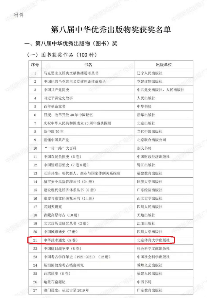日前,由中国出版协会举办的第八届“中华优秀出版物奖”评选揭晓,北京体育大学出版社出版的《中华武术通史》荣获第八届“中华优秀出版物(图书)奖”。这是北京体育大学出版社首次获得该奖项,也是体育专业出版社和体育领域学术著作首获该奖项正奖。