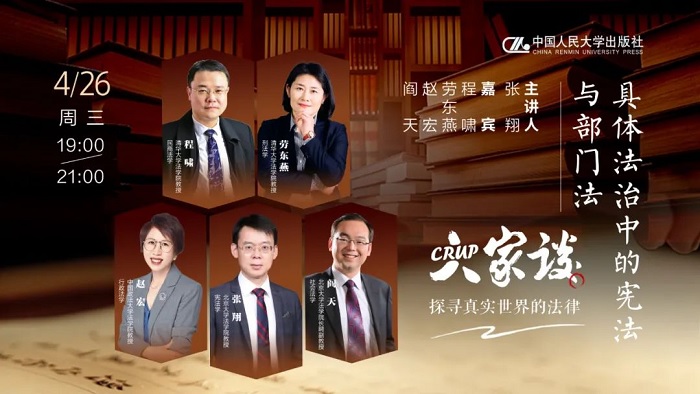 4月26日19:00,本期学术对话以“具体法治中的宪法与部门法”为题,邀请张翔教授与程啸、劳东燕、赵宏、阎天诸位教授,做客CRUP大家谈。